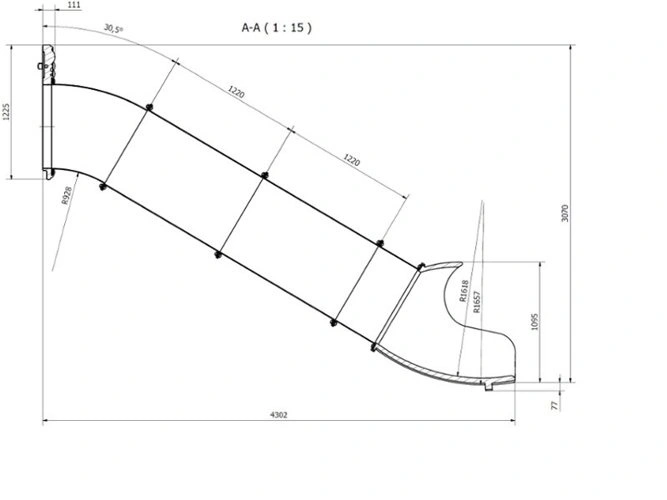 Długość zjazdu 350 cm, szerokość wewnętrzna 55 cm, szerokość zewnetrzna 75 cm