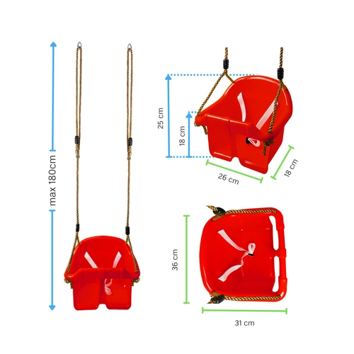 Huśtawka kubełkowa ECO została stworzona z myślą o najmłodszych dzieciach, które wymagają dodatkowego wsparcia i ochrony podczas zabawy. Regulowane liny o grubości 10 mm pozwalają dopasować wysokość huśtawki do wzrostu dziecka oraz rodzaju konstrukcji. Dzięki temu huśtawka rośnie wraz z maluchem i może służyć przez kilka sezonów.