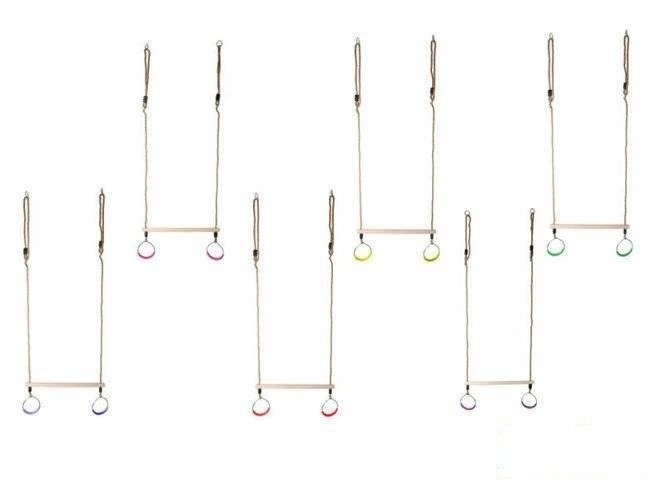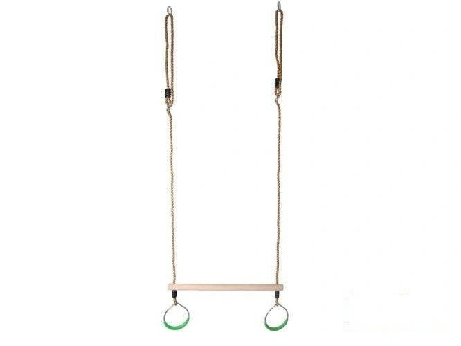 • Drewniany trapez z okrągłymi obręczami na linach. Wspaniały sposób bezpiecznej zabawy połączony z aktywnością fizyczną.