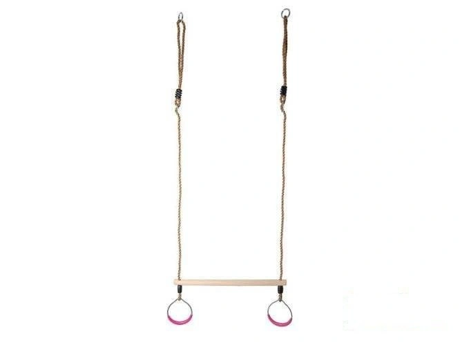 • Drewniany trapez z okrągłymi obręczami na linach. Wspaniały sposób bezpiecznej zabawy połączony z aktywnością fizyczną.